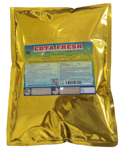 EDTA FRESH. Thành phần chứa a xít hữa aminopolycarboxylic nguyên chất rất mạnh. Edta fresh có công dụng khử kim loại nặng, khử phèn, thuốc trừ sâu trong môi trường nước nuôi tôm. EDTA FRESH định kỳ sử dụng làm cho môi trường nước ao nuôi tốt hơn, ổn định độ kiềm, độ PH và màu nước đẹp. Sản phẩm có công dụng tăng độ kiềm và giảm độ cứng của nước, cho tôm nhanh cứng vỏ, cân bằng được hệ đệm và hệ sinh thái ao nuôi, cho PH ít giao động giữa buổi sáng và buổi chiều, giữu ngày và đêm. Vì thế, tôm cá ít bị bệnh, ít sốc, tôm khỏe mạnh và lớn nhanh đồng thời giảm hệ số thức ăn.